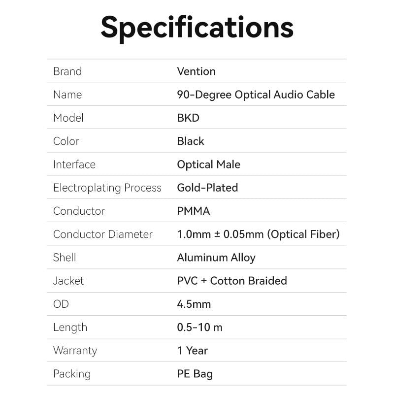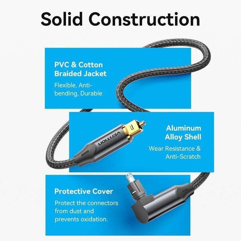 Cáp quang Audio vải dù cao cấp Vention 90-Degree Optical Audio Cable ( Đầu mạ vàng, gập chữ L 90 độ / Xoay 360 độ, Aluminum Alloy )