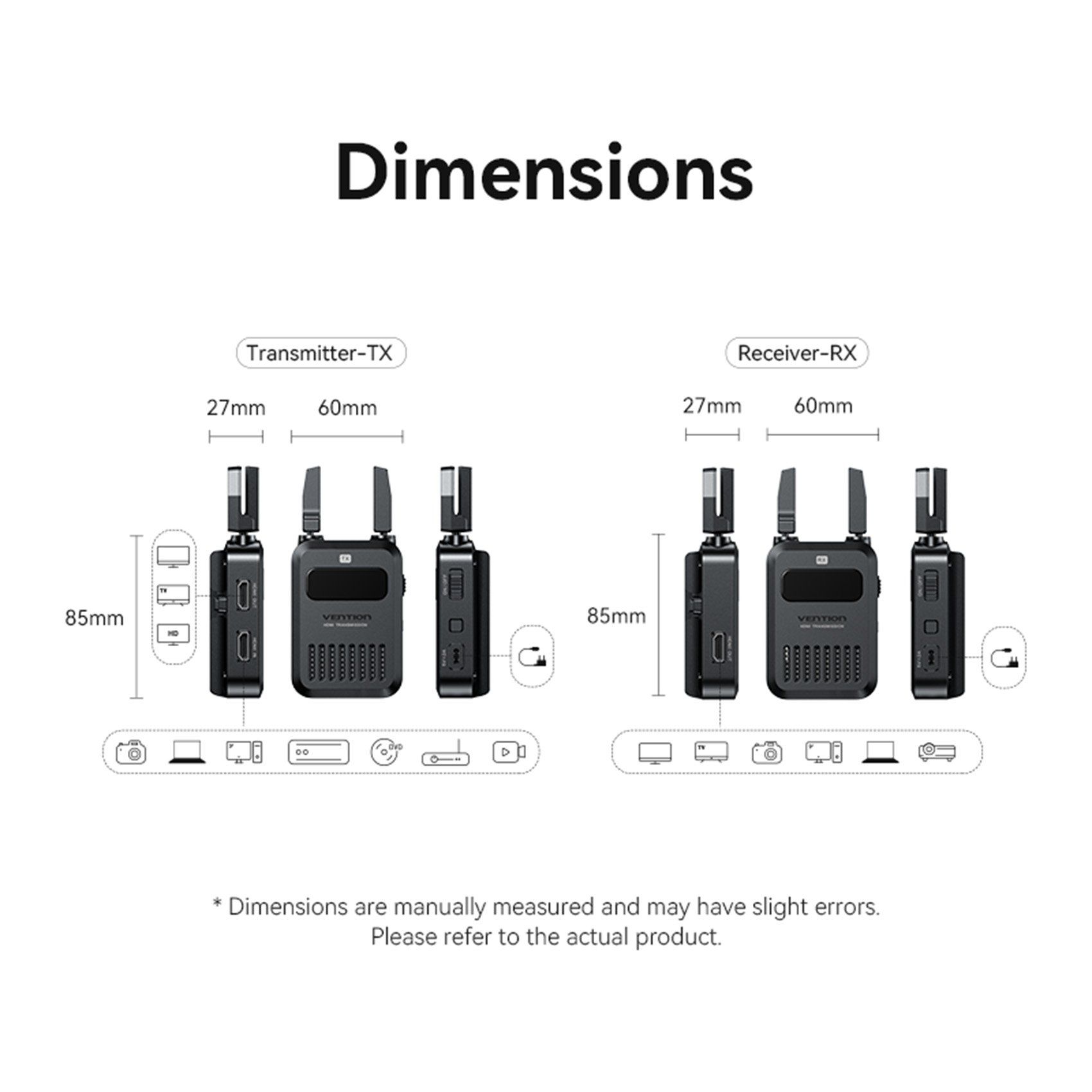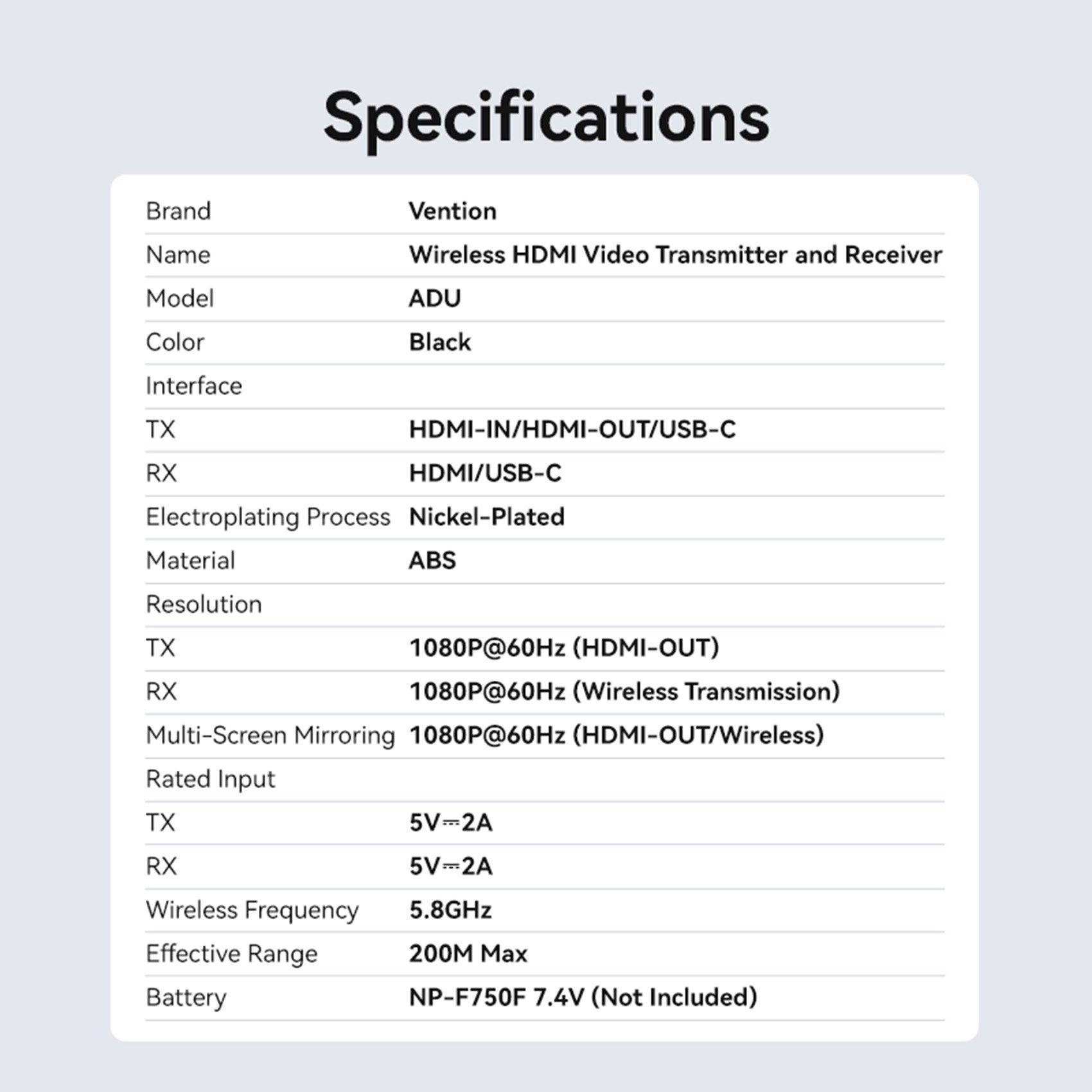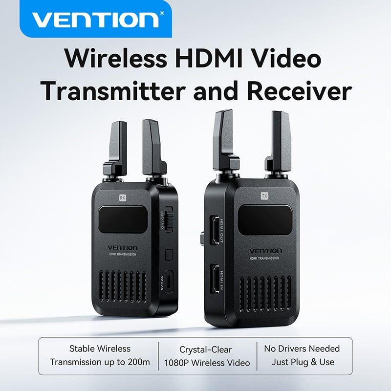 Bộ Truyền Hình Ảnh HDMI Không Dây VENTION ADU 1080P@60Hz (Transmitter and Receiver, 200M Stable Transmission, Up to 1 TX to 4 RXs, Support NP-F750 7.4V Battery, Wireless + Wired Flexibility, LED Status Display)