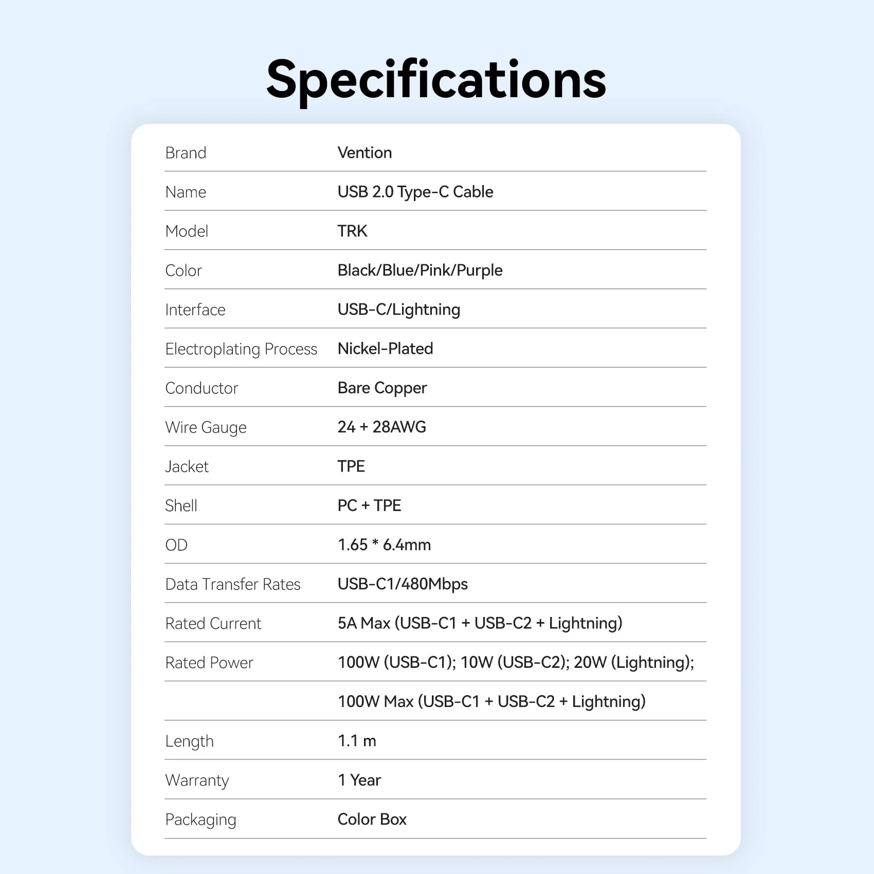 Rated Power: 100W (USB-C1); 10W (USB-C2); 20W (Lightning); 100W Max (USB-C1+ USB-C2+ Lightning)