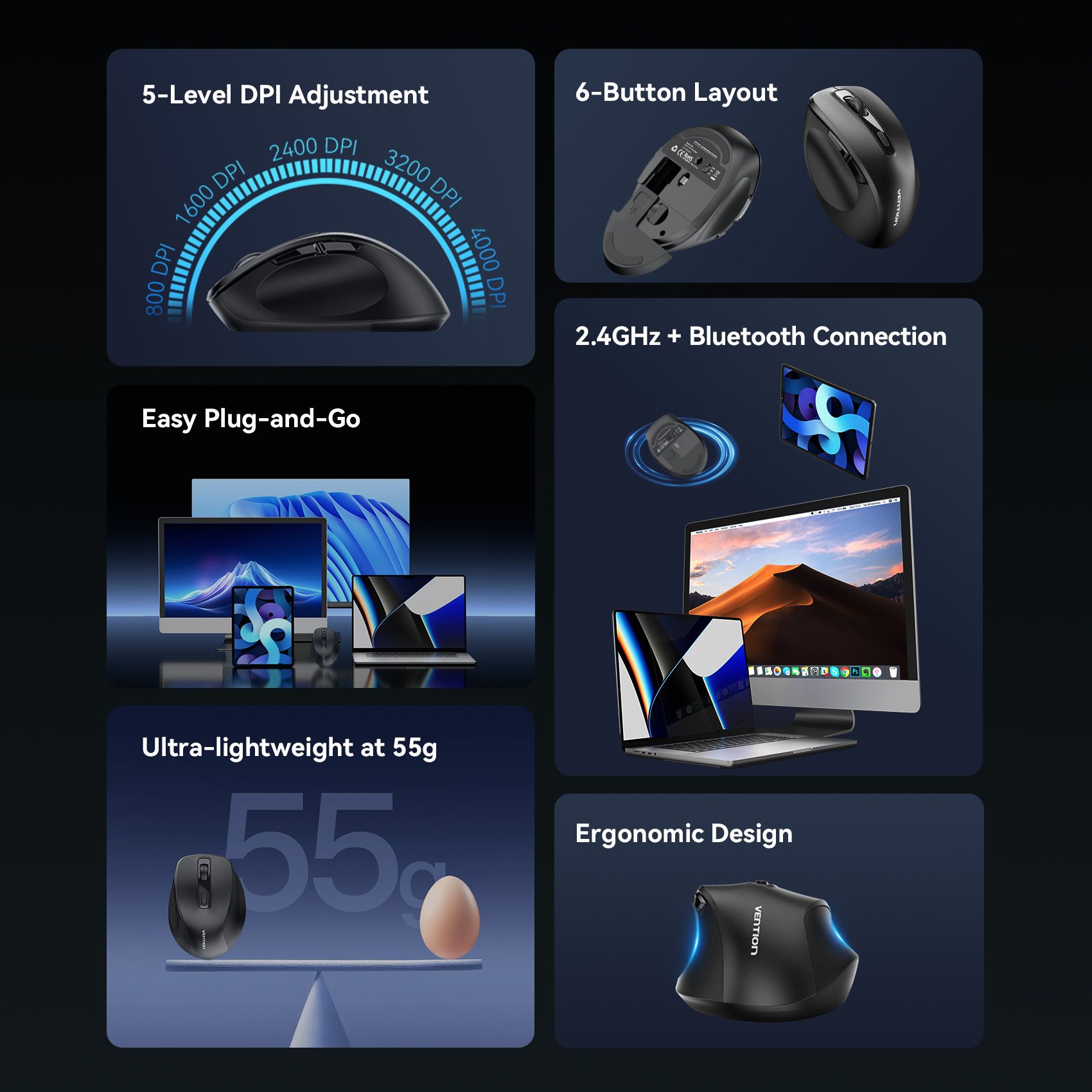 Name: 6-Button 2.4GHz + Bluetooth Wireless Ergonomic Mouse
