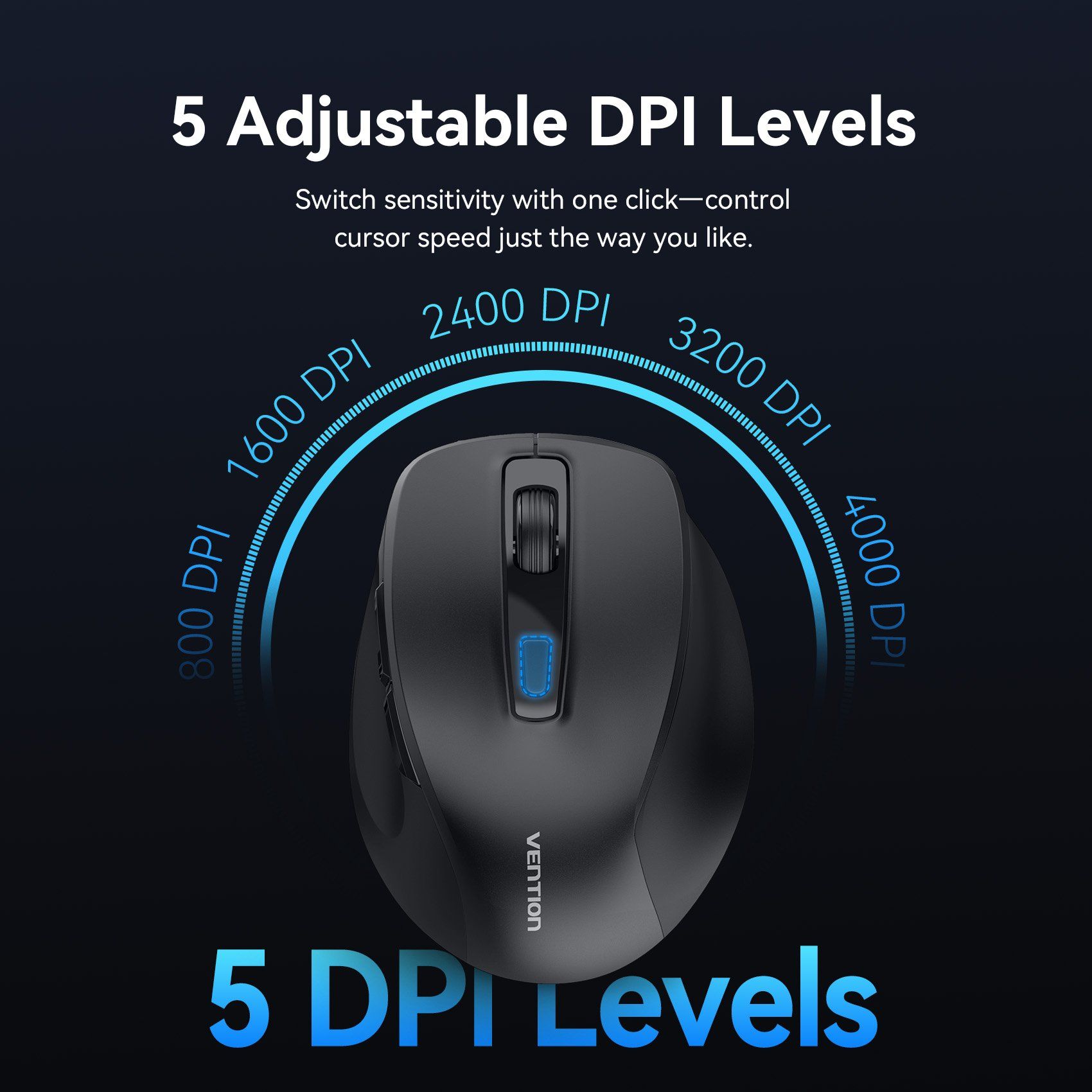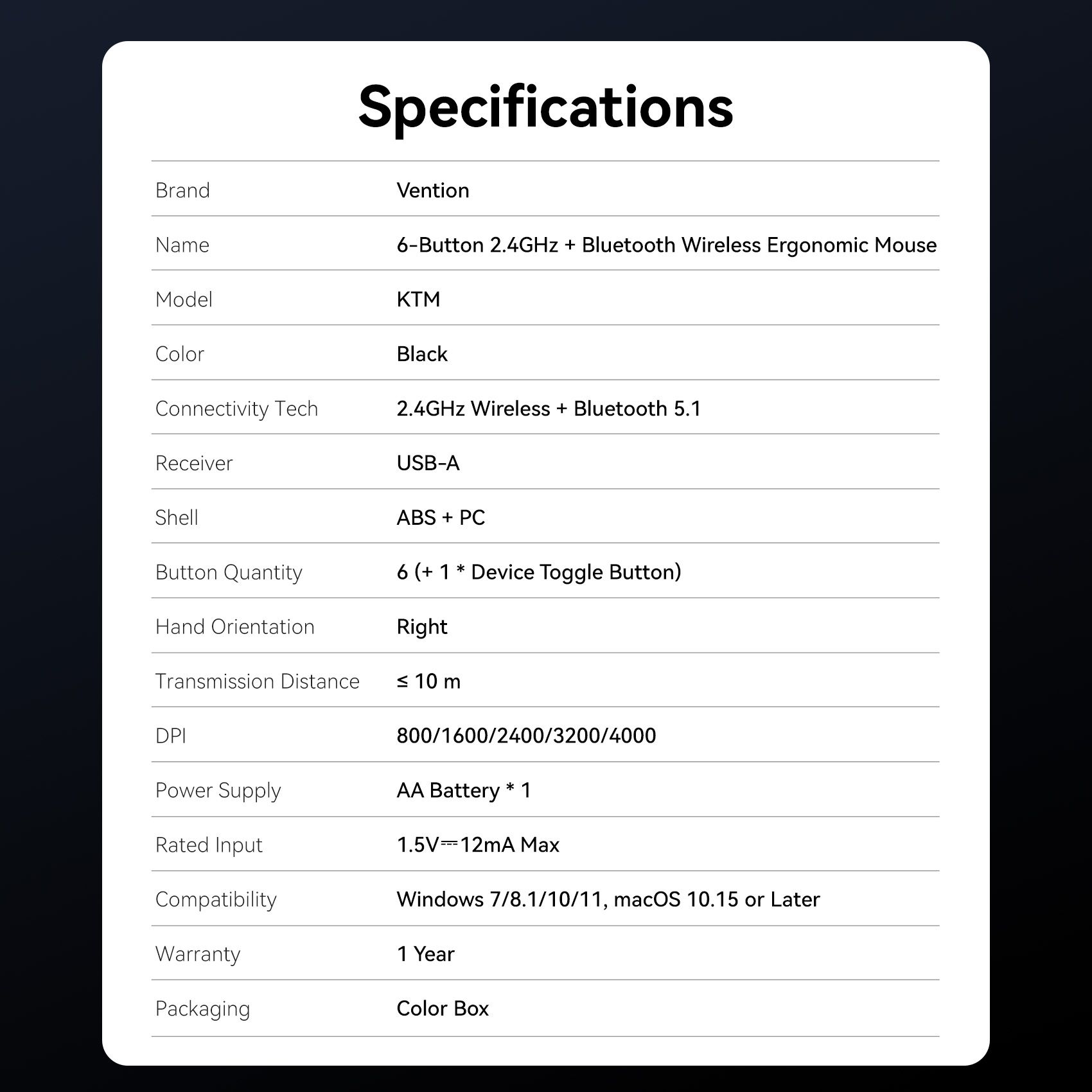 Chuột Không Dây Công Thái Học VENTION KTM (2.4GHz + Bluetooth 5.1, 4000DPI, 5-Level DPI Adjustment, 6 Buttons, ≤10m, AA Battery)