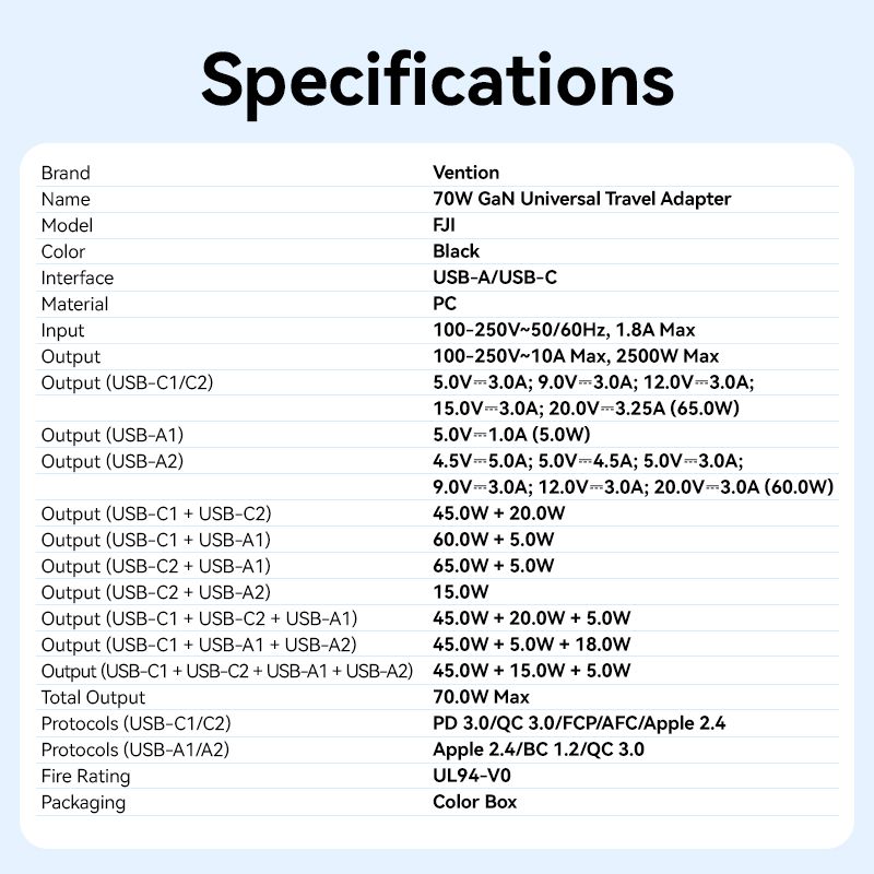 Output (USB-C1/C2): 5V-3A; 9V-3A; 12V-3A; 15V-3A; 20V-3.25A (65W)