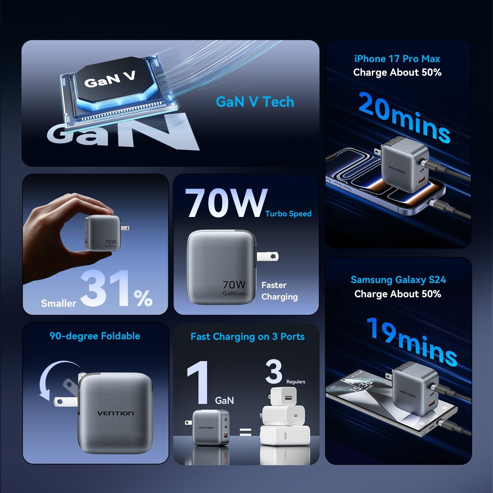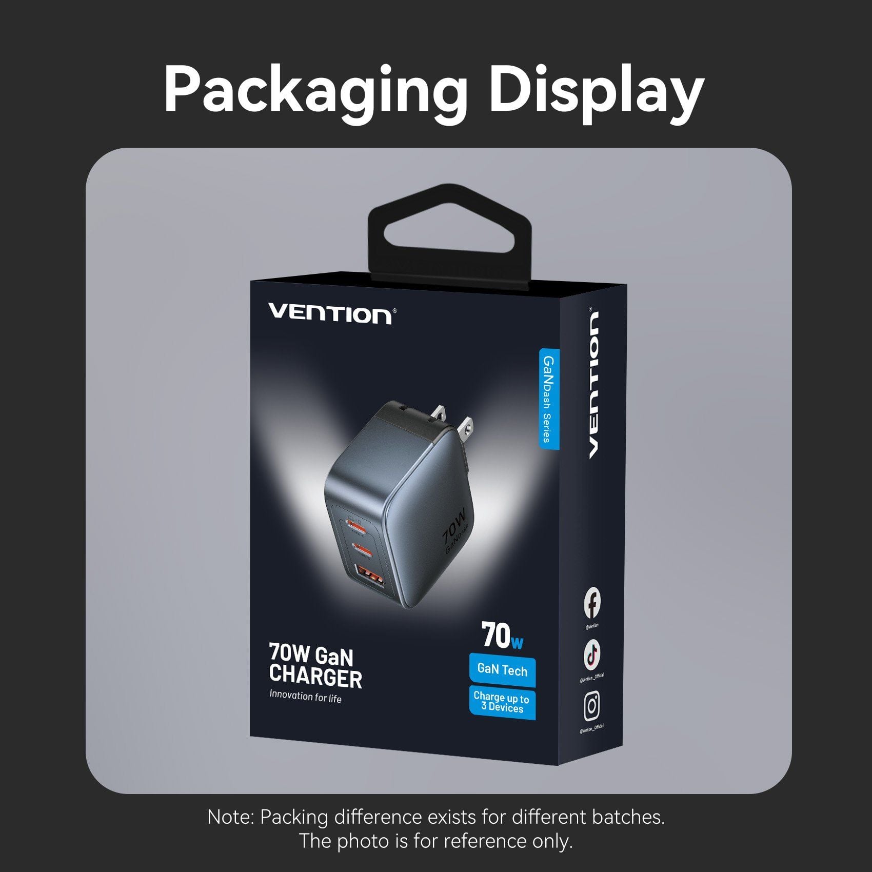 Củ Sạc Nhanh VENTION FEX 70W (2*Type-C + 1*USB-A, GaN V Tech)