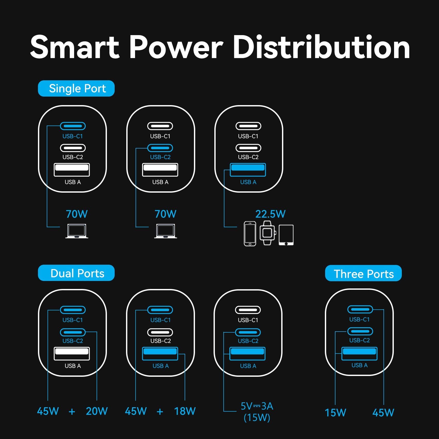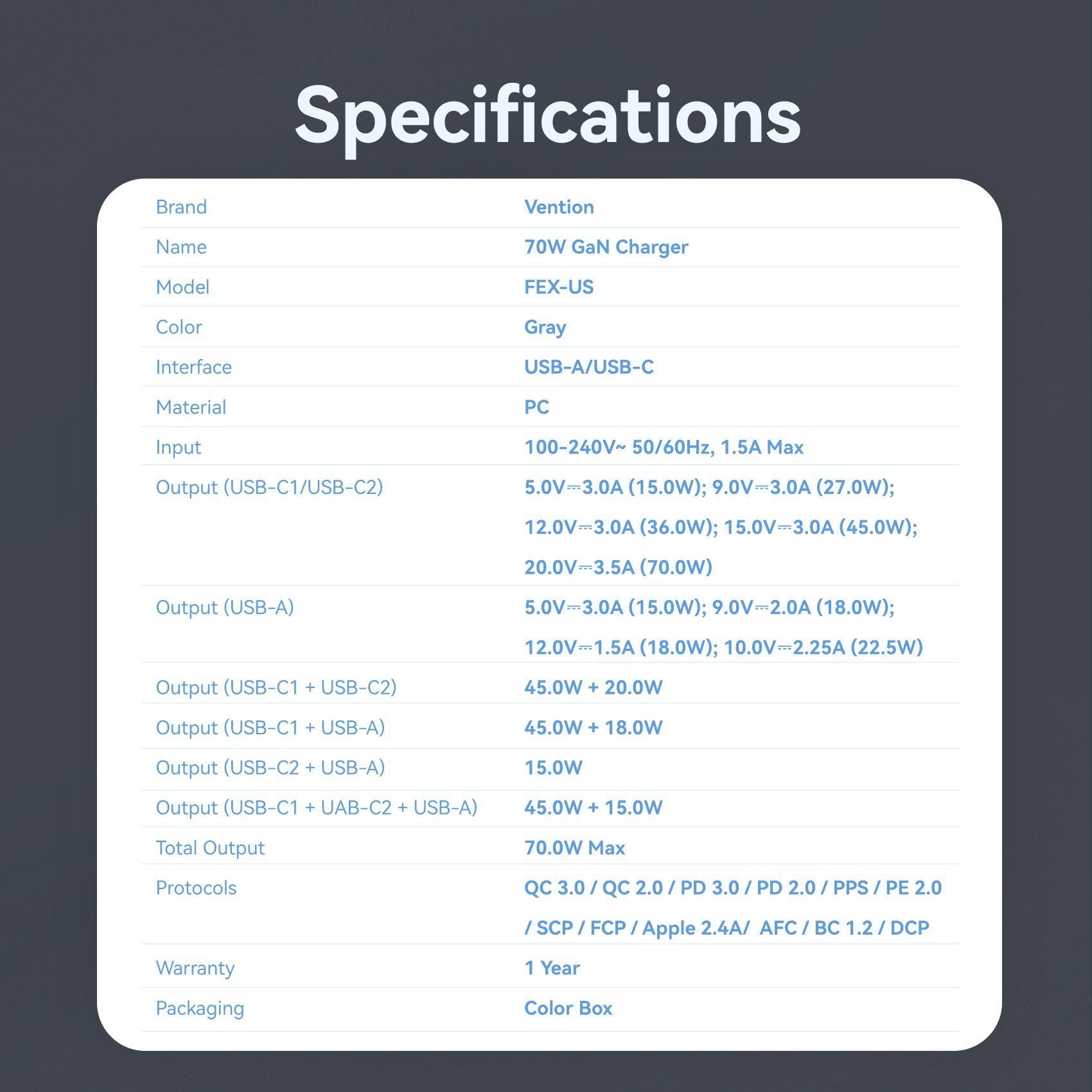 Output (USB-C1/USB-C2): 5V-3A(15W); 9V-3A (27W); 12V-3A(36W); 15V-3A (45W); 20V-3.5A (70W)