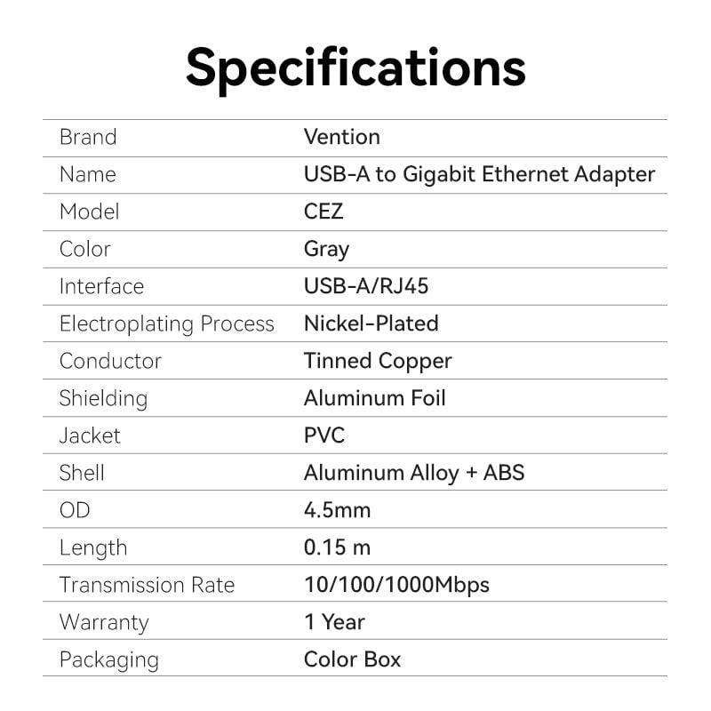 Đầu Chuyển Mạng LAN USB-A to Gigabit Ethernet VENTION CEZ (1Gbps, 0.15m)