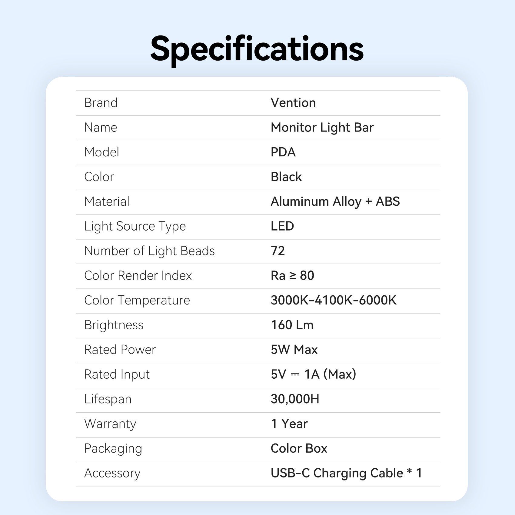 Đèn Treo Màn Hình Chống Chói Bảo Vệ Mắt VENTION PDA (3-Level Color Temp, Brightness Memory Function, Asymmetric Light Source, 6000K, Ra ≥ 80)