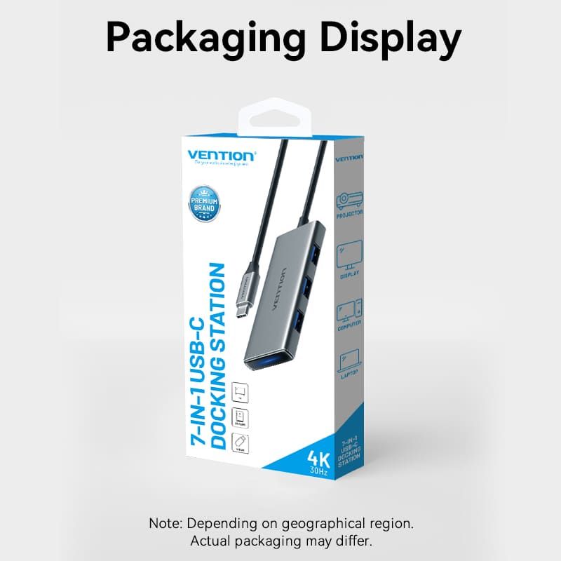 HUB chuyển đa năng Vention 7 in 1 Docking Station - TOP (Type C to HDMI/USB 3.0x3/SD/TF/PD, 0.115m Aluminum Alloy)