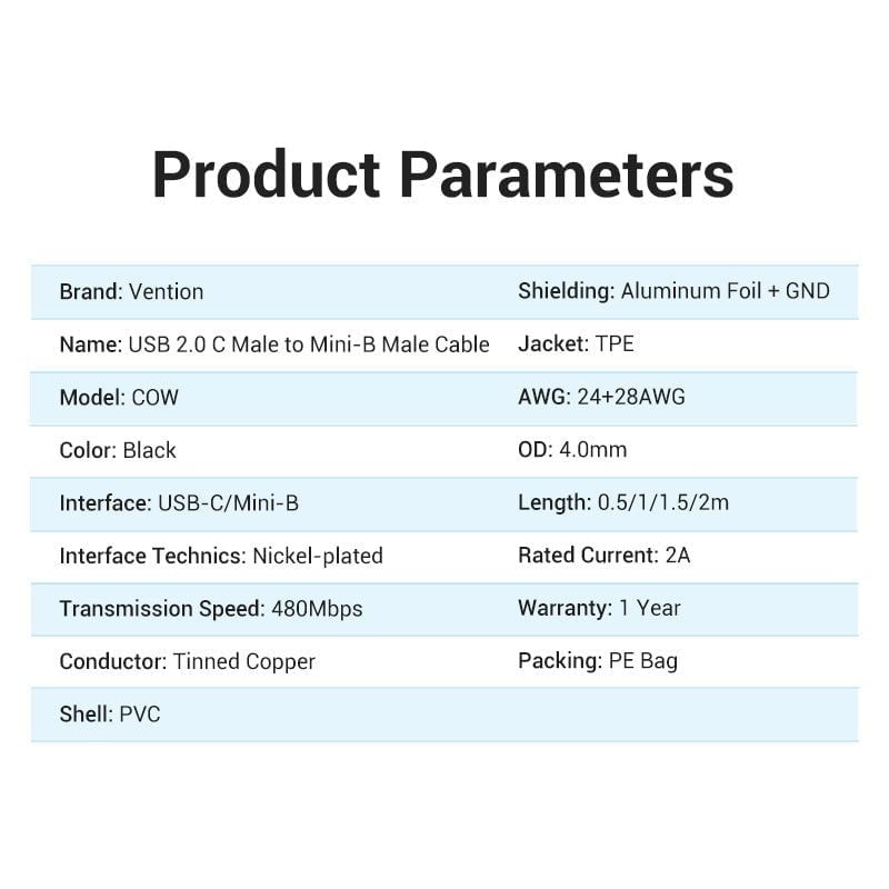 Vention USB 2.0 C Male to Mini-B Male 2A Cable