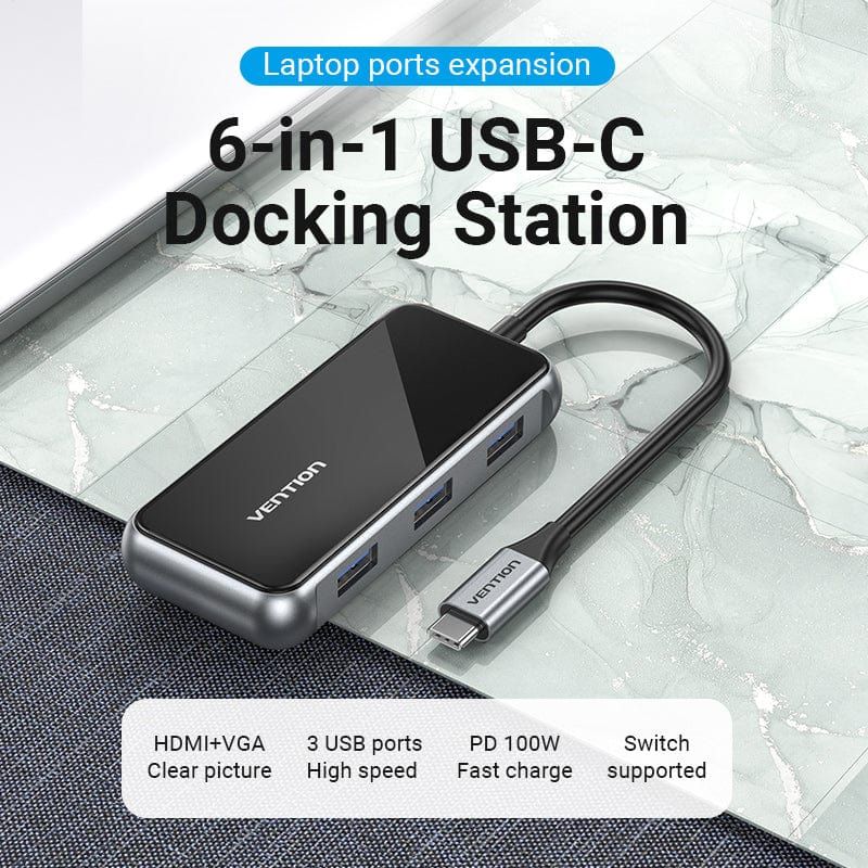 HUB mở rộng đa năng Vention Type C to HDMI/VGA/USB 3.0x3/PD Docking Station - TFJ (PD100W, 4K@30Hz, 5Gbps)